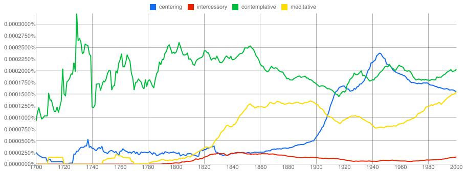 What makes the above observation all the more remarkable is that before 1950 these two phrases did not parallel at all. "Intercessory prayer" peaked at 14 per billion around 1850 at a time when "contemplative prayer" was quite rare.